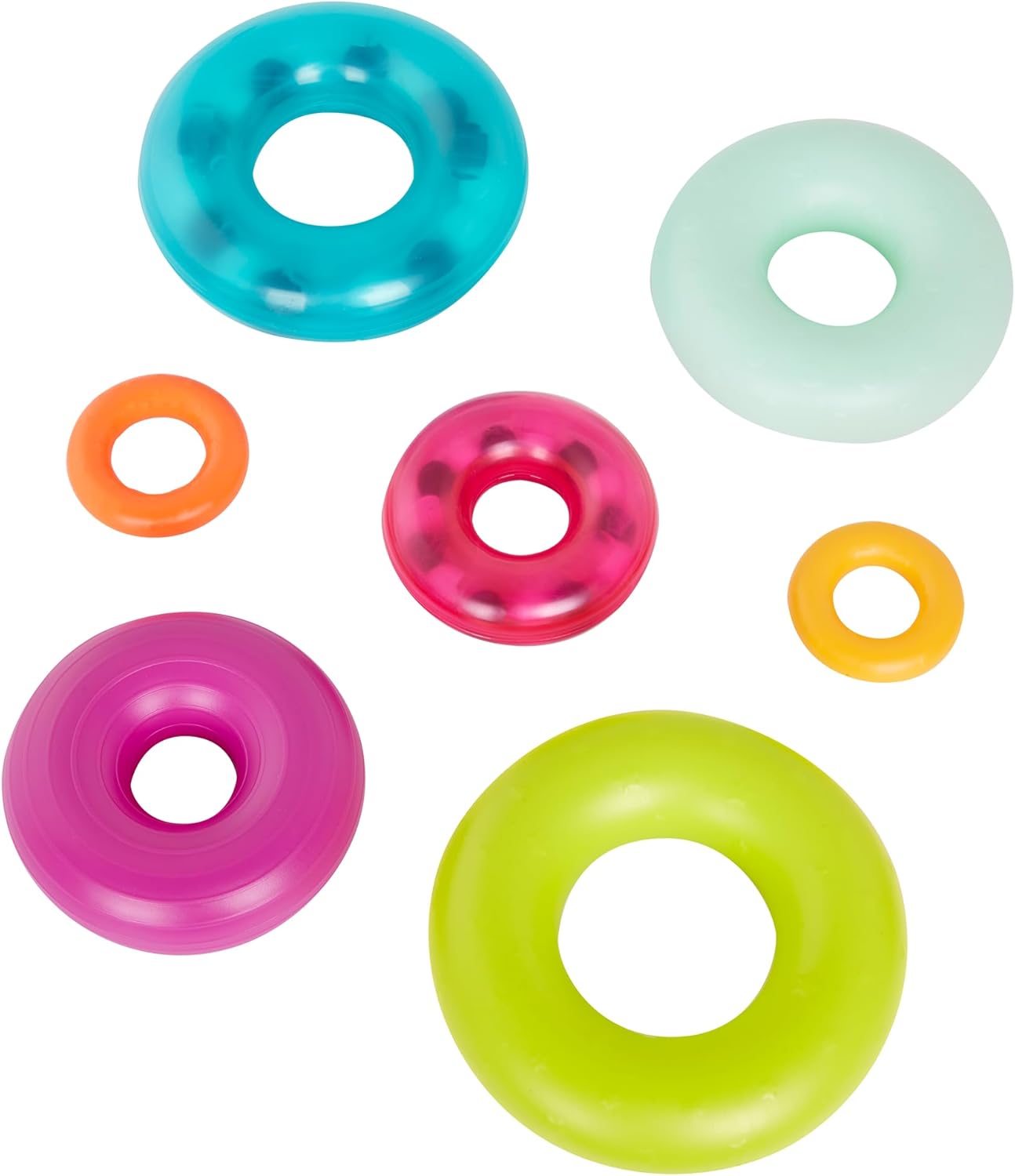 A bright and soothing set of stackable teething rings designed to support sensory play and early development. Each soft, textured ring helps ease teething discomfort while encouraging fine motor skills, color recognition, and hands-on exploration for babies and toddlers 6+ months.